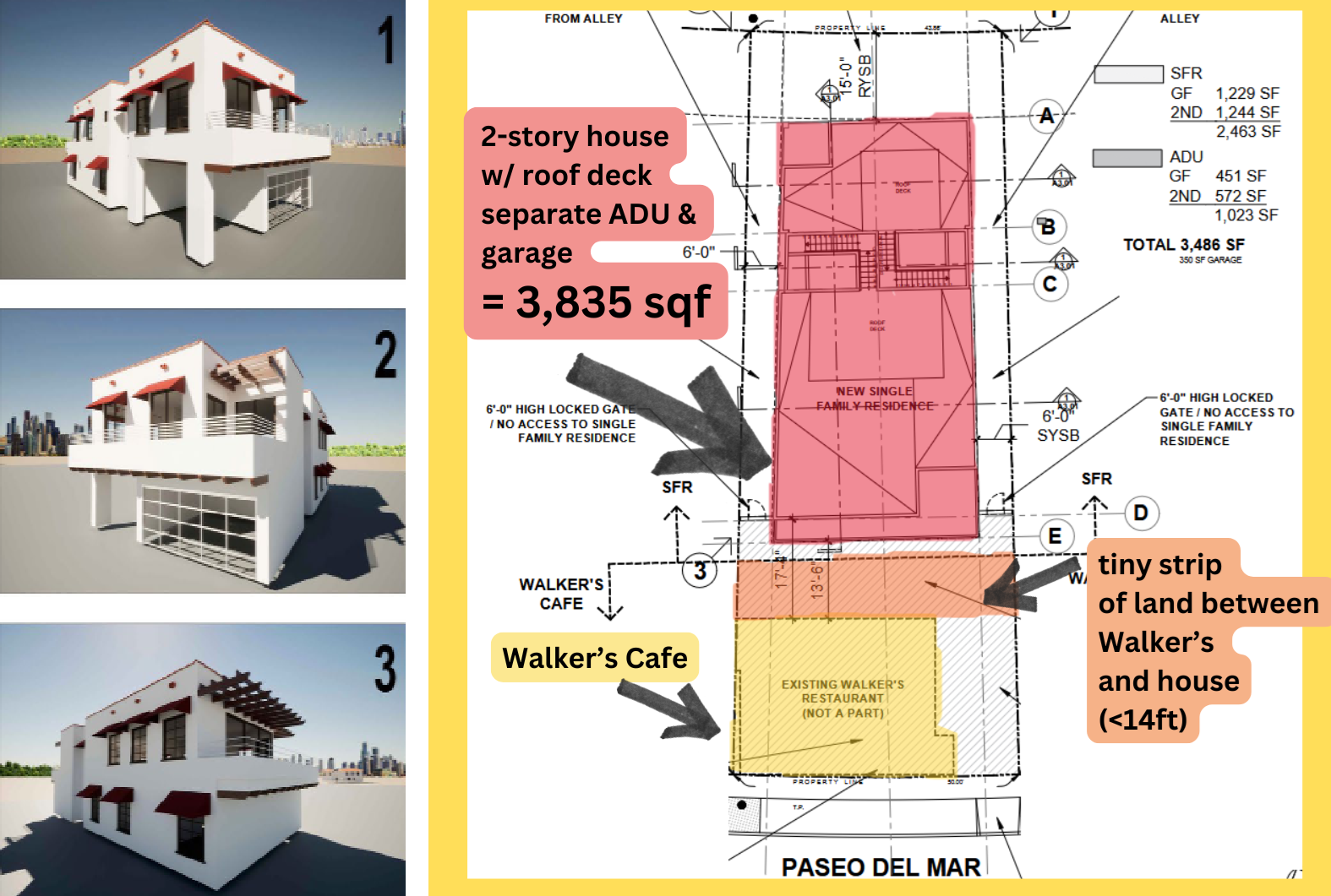 However, their plans subsequently changed. They now want to build a massive, 3,500+ sqf, two-story residential development with a separate Accessory Dwelling Unit and garage right behind Walker’s Cafe, leaving less than 14 feet between the cafe and this large new building. (To compare, the houses on either side of the property are single-family homes just under 2,000 sqf. Walker’s itself is around 750 sqf.)
